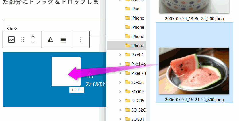 ■色で囲った部分に、Windowsなら「エクスプローラー」。Macなら「ファインダー」にある画像をドラッグ&ドロップします。